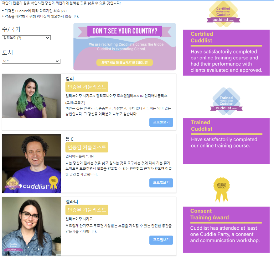 사이트에는 인증된 커들러 (cuddler 포옹전문가)의 사진 , 거주지, 소개 글이 있다.