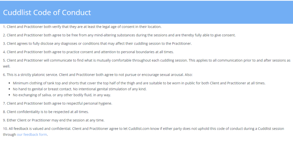 10. 모든 피드백은 중요하며 기밀로 유지됩니다.피드백 양식 을 통해 Cuddlist 세션 중에 어느 한 당사자가 이 행동 강령을 지지하지 않는 경우 Cuddlist.com에 알리는 데 동의합니다 .